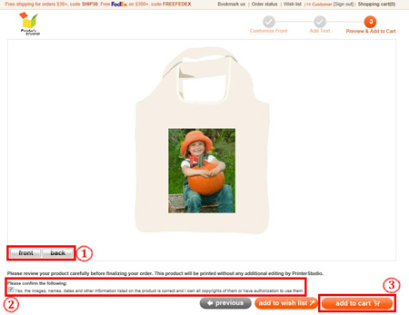 You will see a preview of your personalized item at this step. Click previous button at the bottom of the page if you need to make any changes to your design.